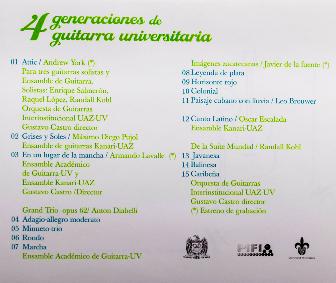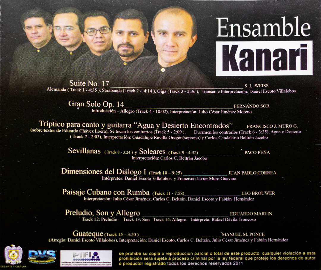 El CD «Cuatro Generaciones de Guitarra Universitaria», registrado en 2008, es una celebración de la rica herencia y la continuidad de la educación musical en México. Este disco no solo incluye interpretaciones del ensamble Kanari, sino que también presenta la Premier Discográfica de una variedad de obras en colaboración con alumnos y maestros de la Universidad Veracruzana (UV) y la Universidad Autónoma de Zacatecas (UAZ).